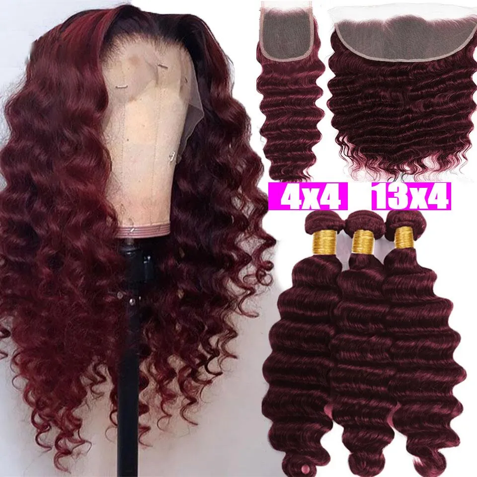 Red Bundles #99j Loose Deep 3 Bundles With 13x4 Transparent Lace Frontal Brazilian Hair