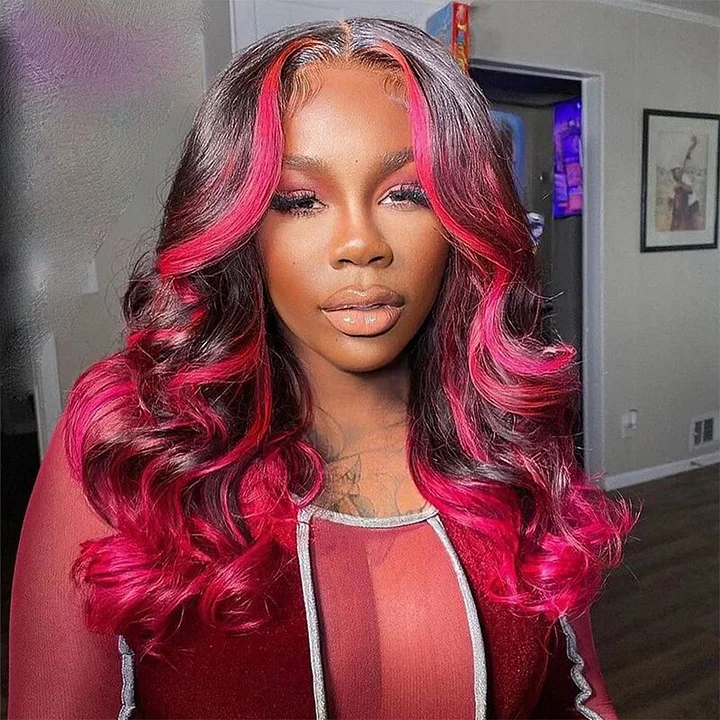 Black With Pink Highlight Stripes Body Wave Lace Front Wig 100% Real Human Hair