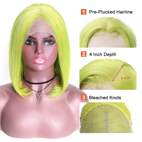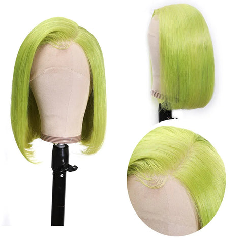 180% Density Fluorescent green Short Bob Lace Front Straight Human Hair Wigs Transparent Lace