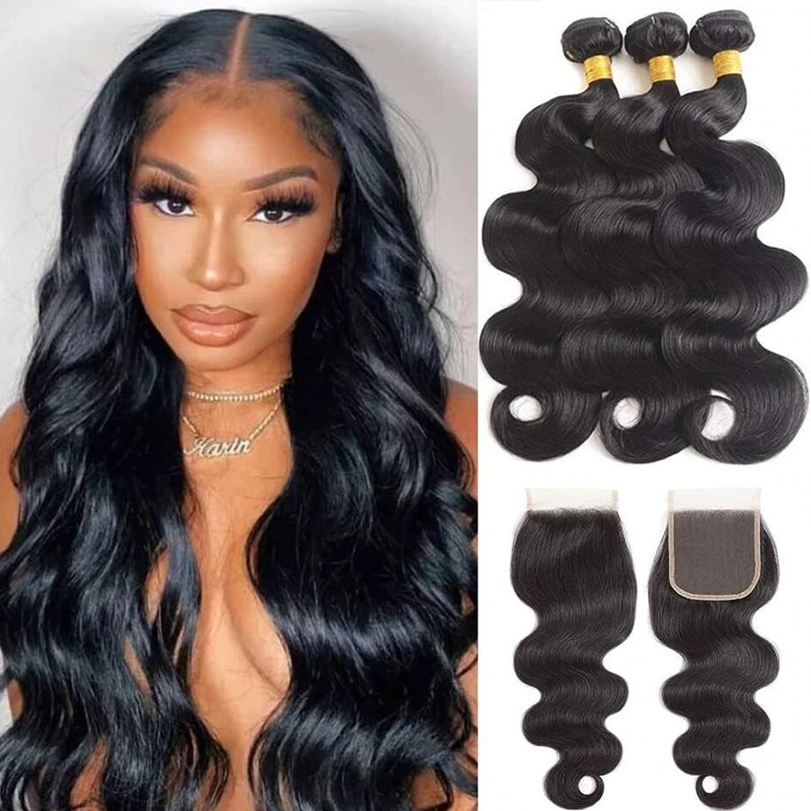 (B1)Brazilian Hair Body Wave 3 Bundles With 4x4 Closure Human Hair Extension for women