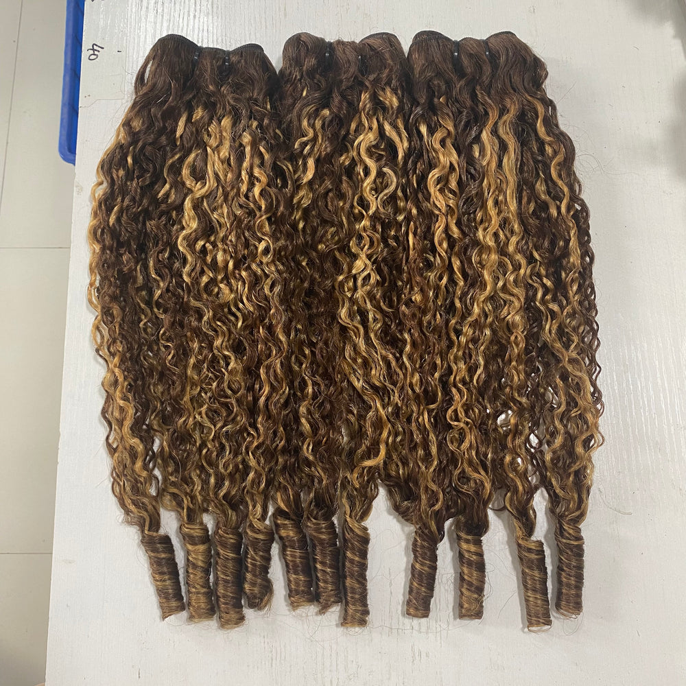 Highlight P4/27 Colored Burmese Curly 3 Bundles With 4x4 Transparent Lace Closure With Spriral End Human Hair
