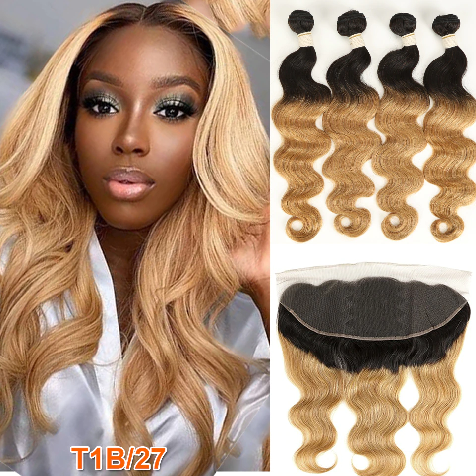 1B/27 Ombre Body Wave 4 Bundles With 13x4 Lace Frontal Pre Colored Ear To Ear