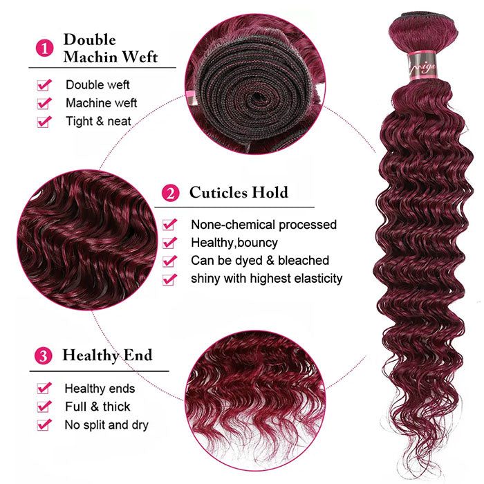 Red Bundles #99j Deep Wave 4 Bundles with 13x4 Frontal with transparent lace