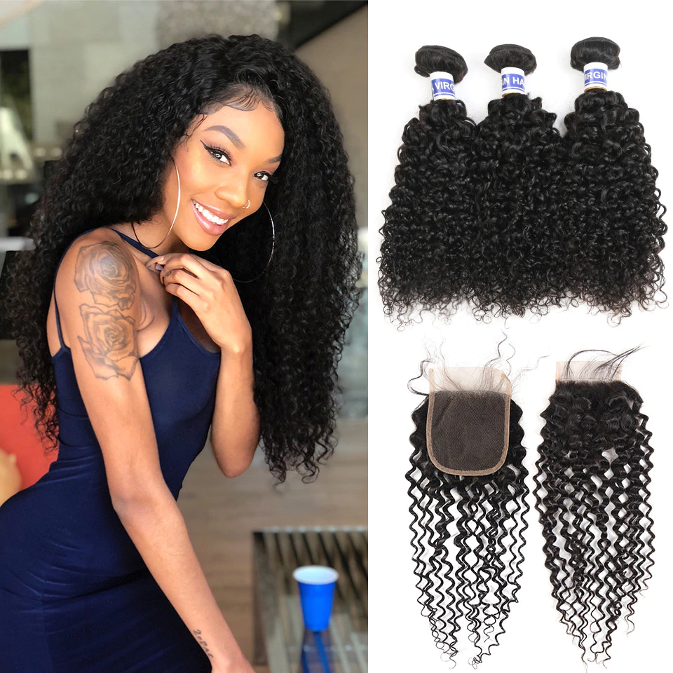 Kinky Curly 3 Bundles With Closure 6x6 lace 100% virgin human hair