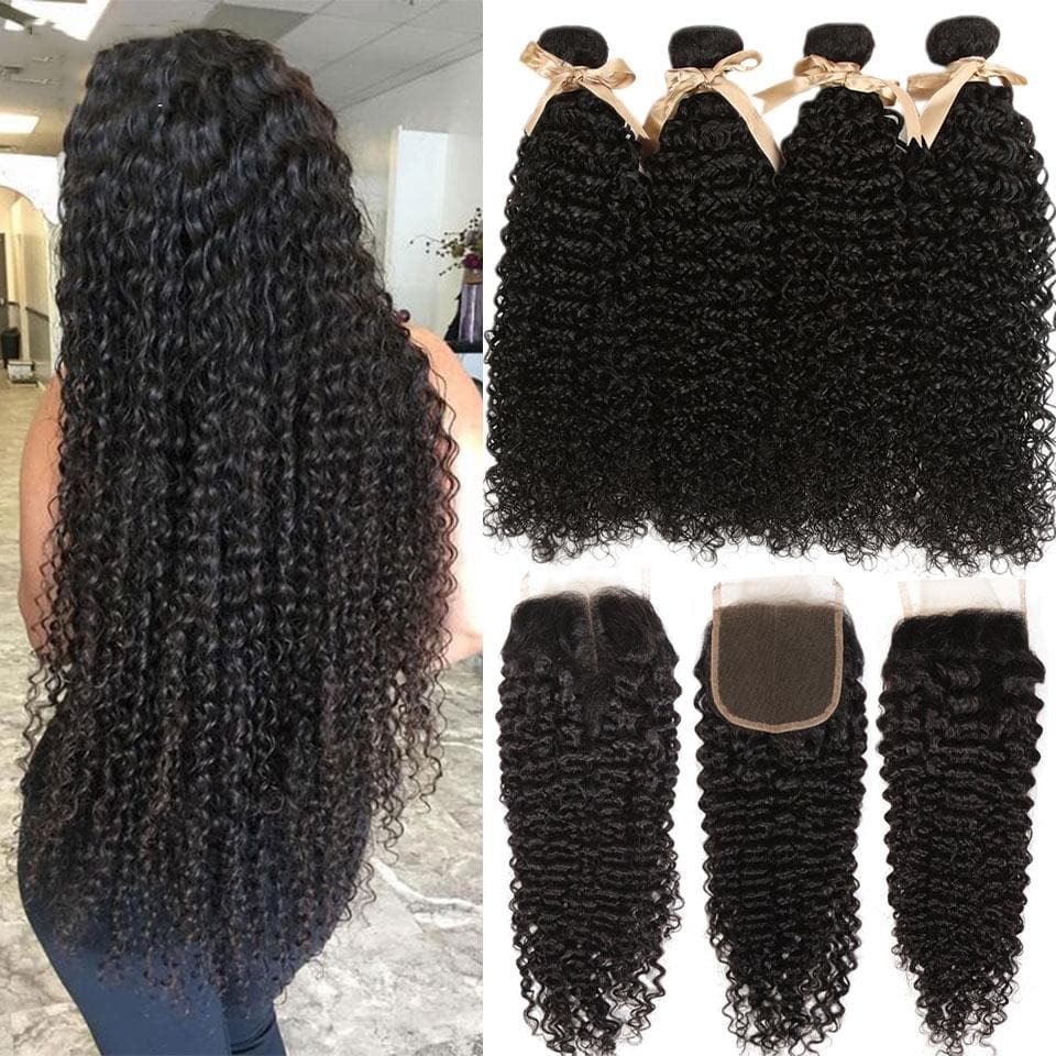 Malaysian kinky Curly Hair 4 Bundles with Closure PrePlucked Hairline Human Hair Extensions with 4x4 Lace Closure