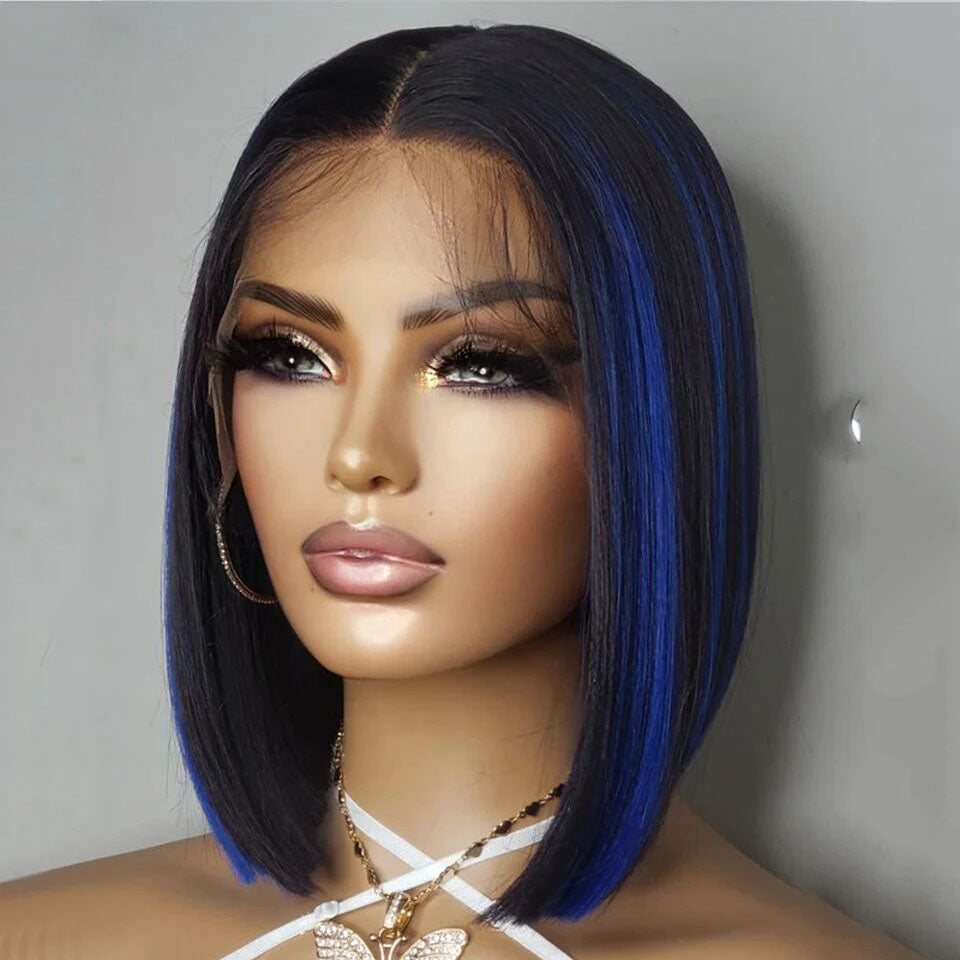 Lumiere Highlight Blue & Highlight Red 13x4 Lace Front Straight Bob Wig Human Hair Transparent Lace Frontal Wigs For Black Women HDZ