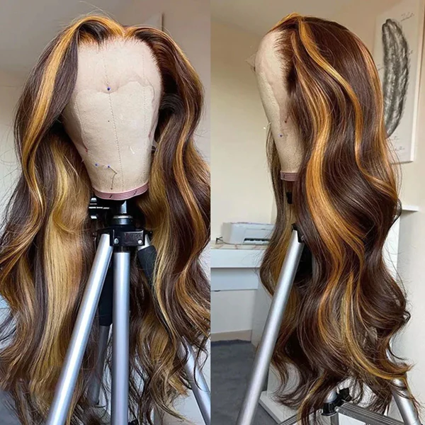 | Hair Type | Highlight 13x4 Lace Front Human Hair Wigs Honey Blonde Body Wave Wig Brazilian Ombre Brown Pre Plucked for Women |