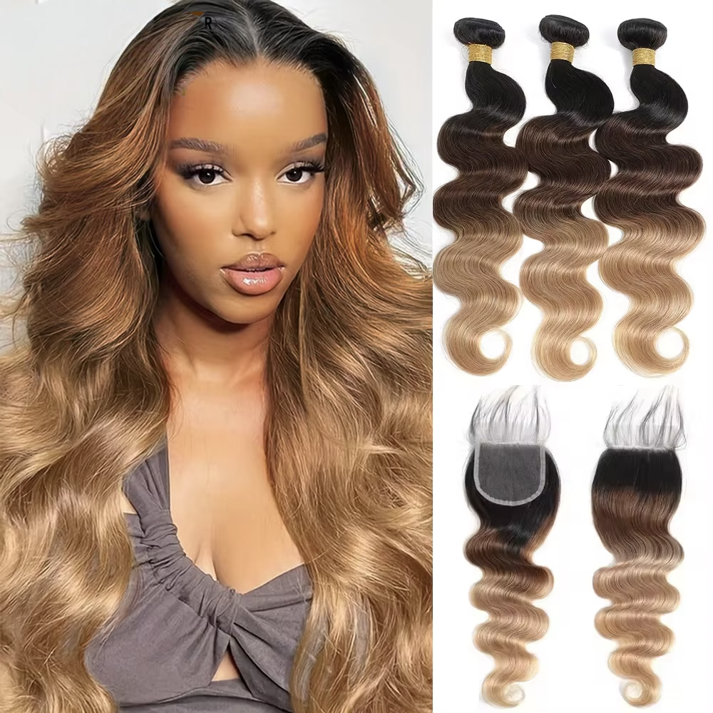 Indian Ombre 1b/4/27 Body Wave 3 Bundles with 4X4 lace Closure