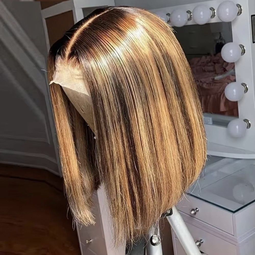 Lumiere Blunt Cut 13x4 Lace Brown Piano Highlights #4/27 Color Straight Bob Wig With Dark Roots Bob Wigs Human Hair Ready To Wear